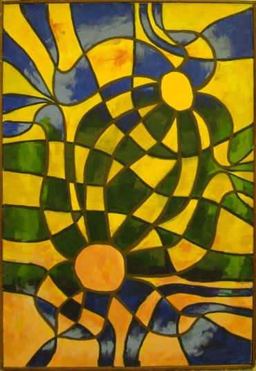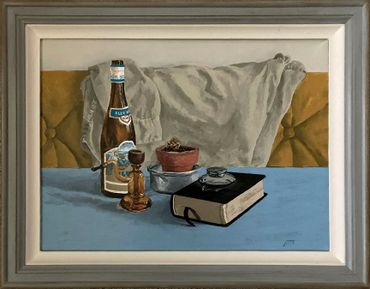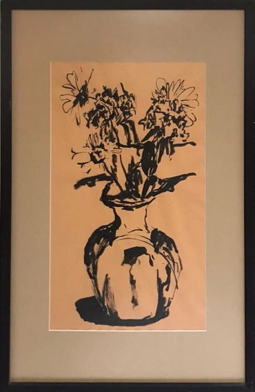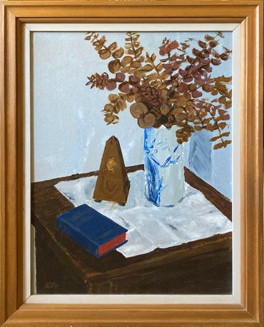 Greg used to create artwork. Here are a few samples. The abstract are acrylic on canvas except for the one that is oil pastels on paper. The black/white still life is ink on paper using a calligraphy brush. Two other realistic paintings are acrylic on canvas capturing some personal items that link to my youthful journey. Most of these were inspired by thoughts and activities back in the 1960s. Long, long ago. Maybe the artist muse will return in retirement years.